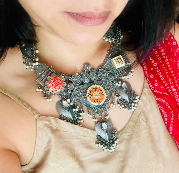 One of a kind oxidized kundan and pearl choker necklace with earrings. Statement piece pretty enough to make you the star of the evening. May complement both casual and formal looks and can be worn for any occasion. High quality material and workmanship for this piece to be your forever friend.